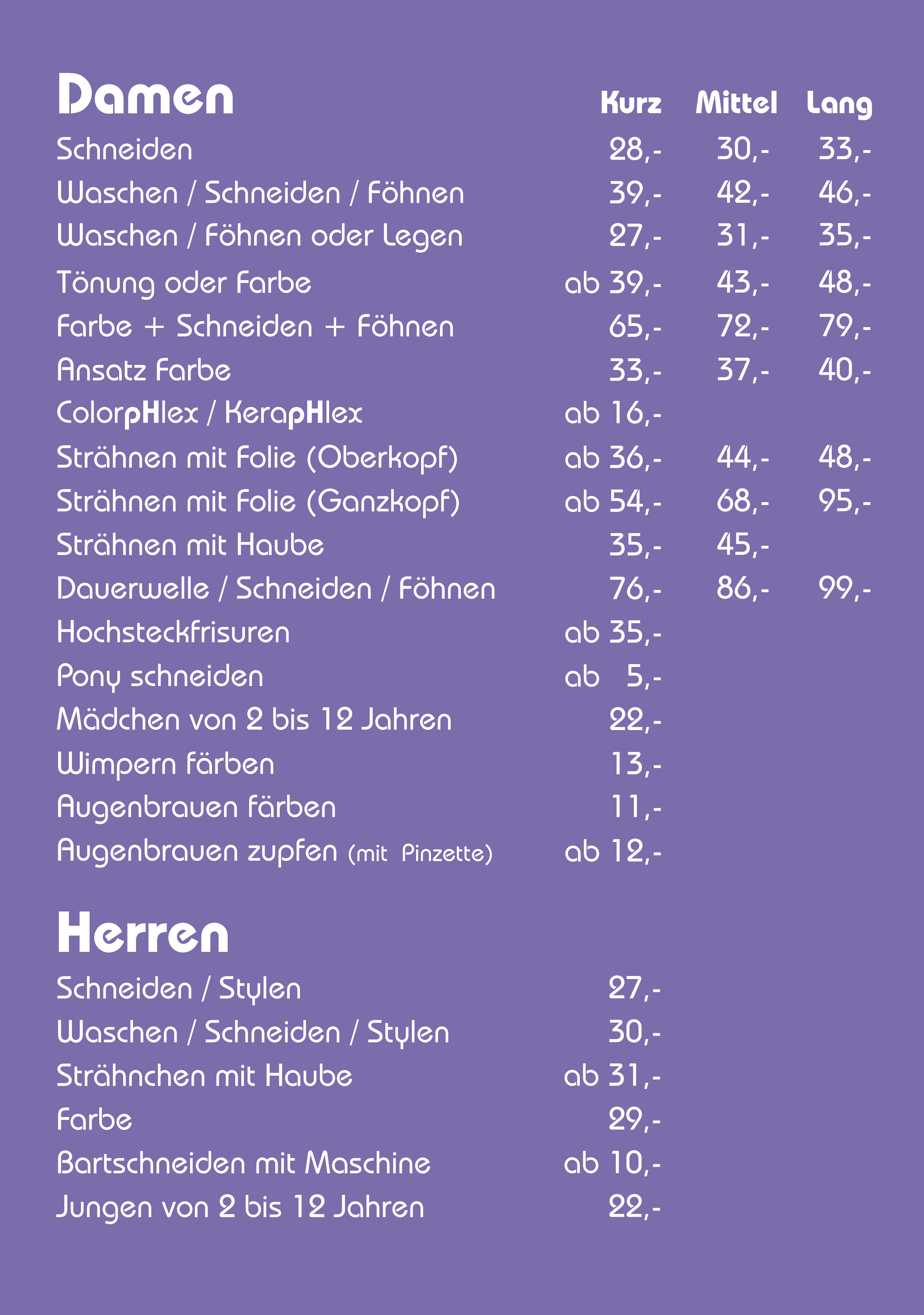 Umfassender Service zu moderaten Preisen. Ein neuer Look, eine Typ- oder Farbberatung oder die passende Hochzeitsfrisur. Bei uns erhalten sie eine typgerechte Beratung und Ausführung. Lassen Sie sich überzeugen und erfahren Sie auf den folgenden Seiten mehr über unsere Leistungen und Preise.